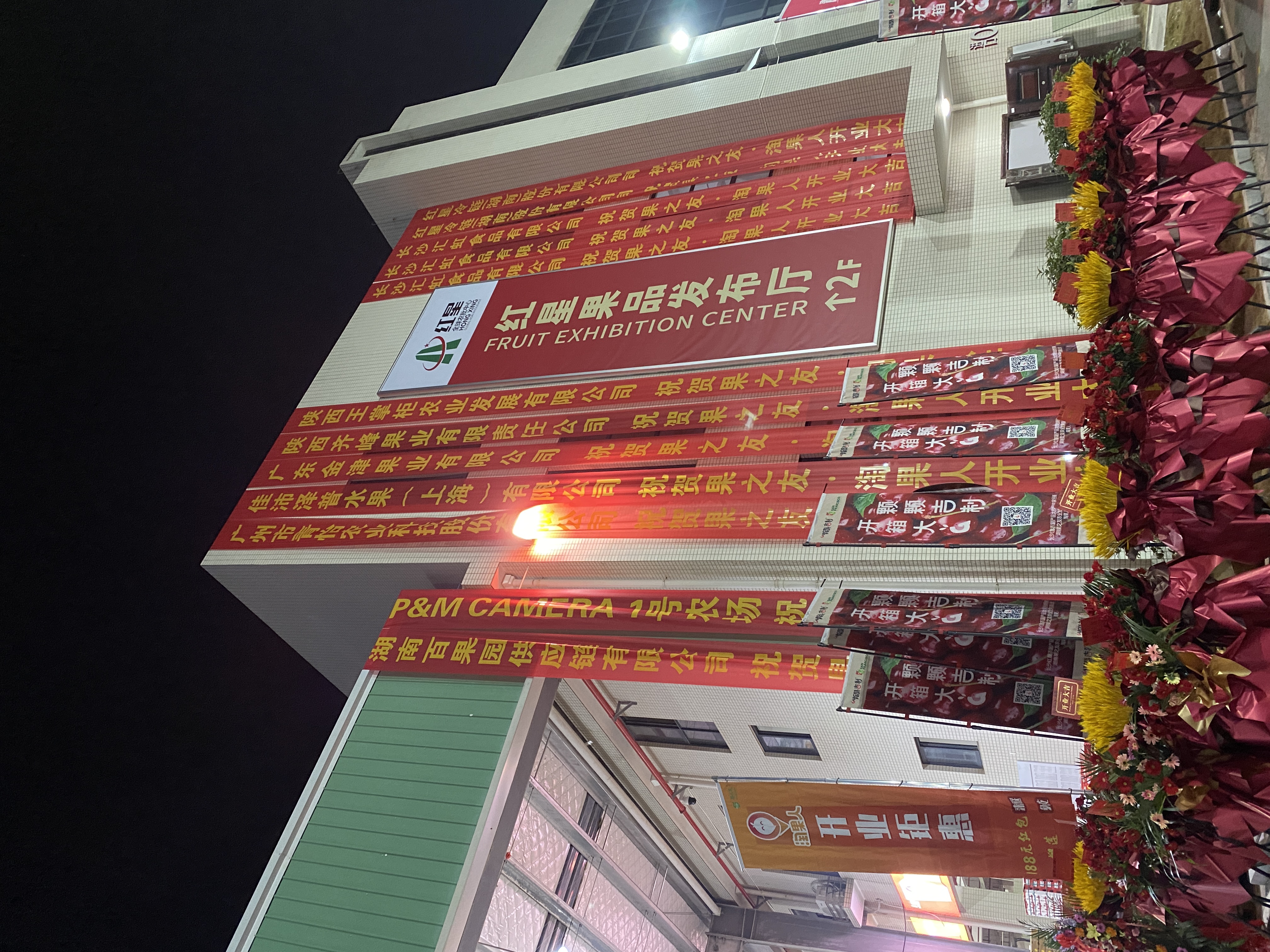 3间国产门面,5间进口门面,12个进口车位,4个国产车位,淘果人的雄厚气势遍布整个市场,一条条随风摇曳的条幅和企业好友们赠送的花篮皆展示着果之友的行业龙头地位与实力,场面壮观喜庆。